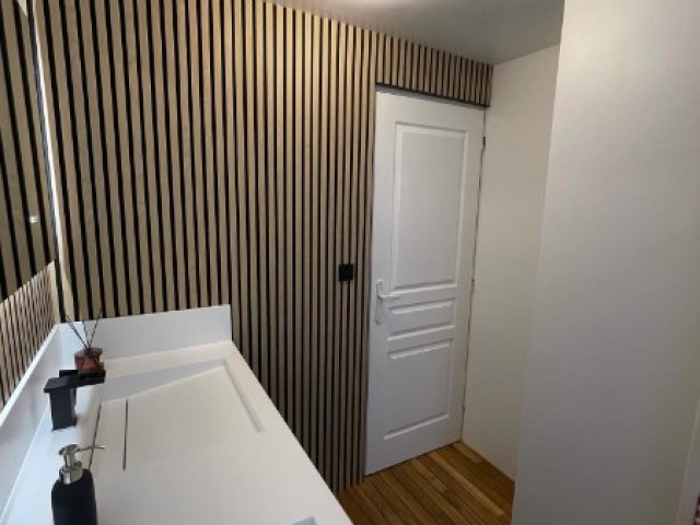 Cette photo dévoile la rénovation impressionnante d'une salle de bain pour un particulier à Dunkerque (59). Les murs sont habillés avec de la résine blanche et des panneaux de tasseaux avec un fond noir hydrofuge, créant un contraste moderne et durable.